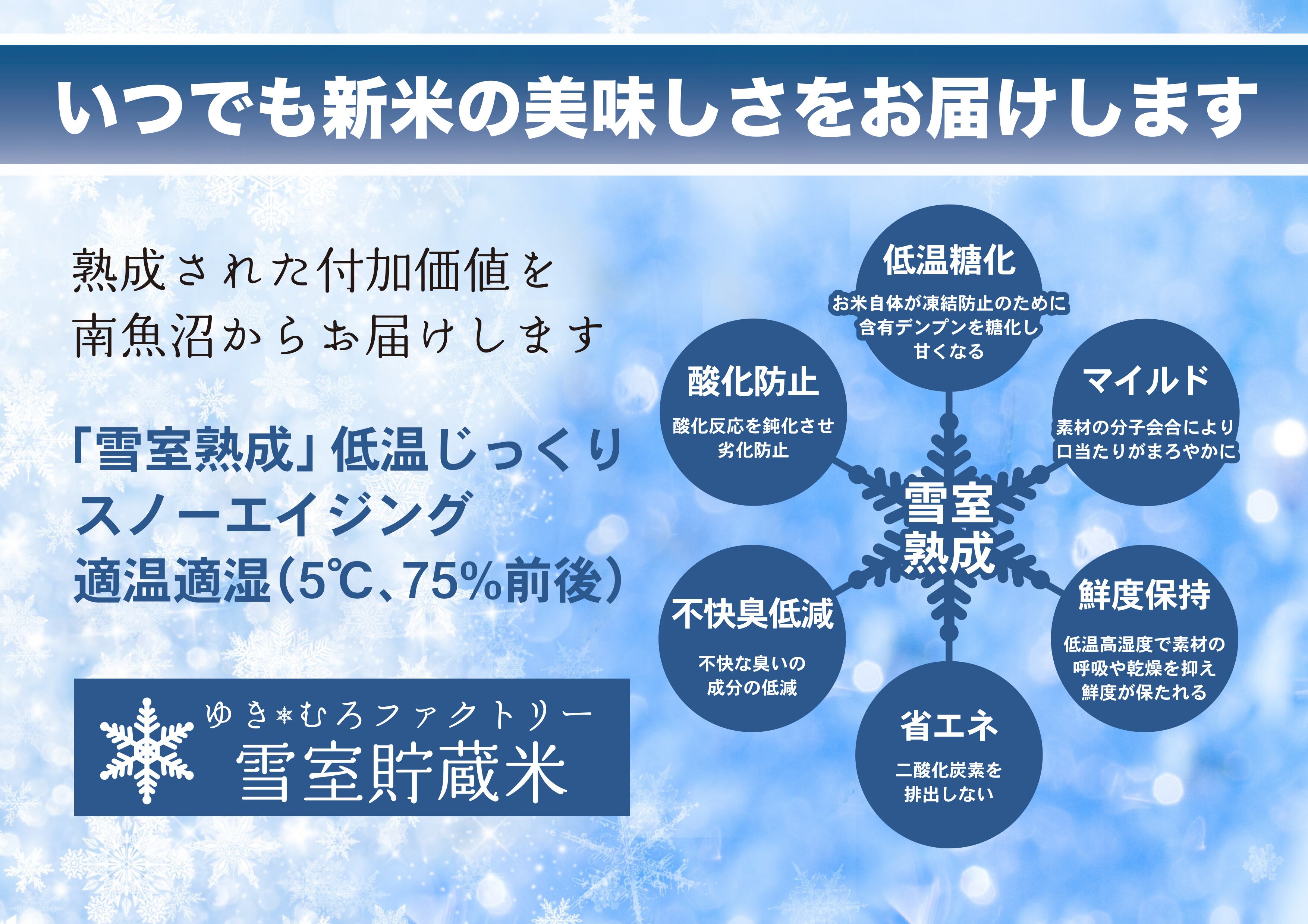 当店所有の天然雪を利用した雪冷房循環システム、【雪室貯蔵庫】は、庫内温度5℃・湿度75%で年間を通して管理しています。それにより適度な湿度で保たれ、古米臭の原因とされる脂肪酸度の上昇を抑制し、新米同様の食味・香りを維持します。また、電気冷蔵庫に比べ二酸化炭素の排出(CO2)排出が低減され地球環境に優しく、丹精込めたお米を更に甘くマイルドな口当たりに熟成させます。